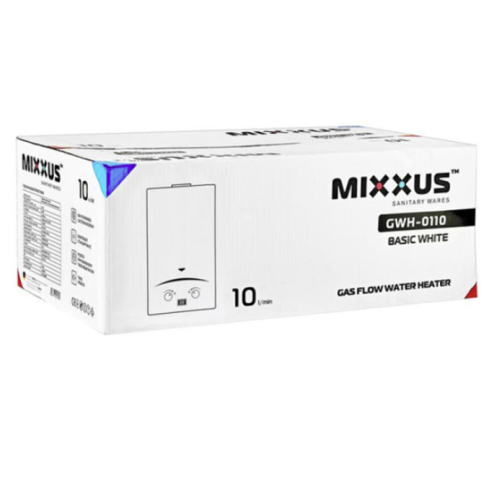 Газовая колонка MIXXUS GWH-0110 – это современный, стильный и функциональный нагревательный прибор с открытой камерой сгорания. Для запуска процесса розжига при открытии крана сети ГВС необходимо обеспечить электропитание, вставив в специальный отсек 2 батареи.