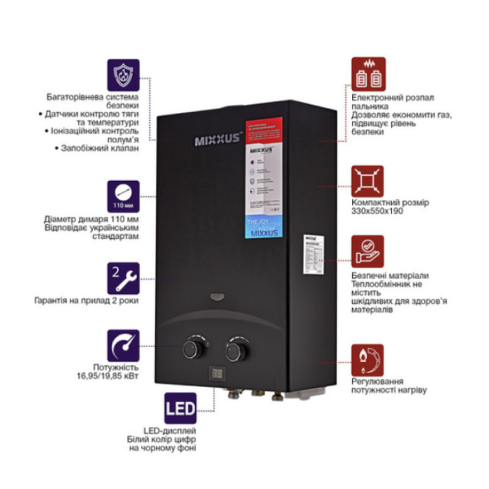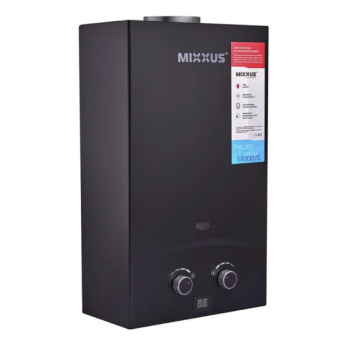 Газовая колонка MIXXUS GWH-0210 – это современный, стильный и функциональный нагревательный прибор с открытой камерой сгорания. Для запуска процесса розжига при открытии крана сети ГВС необходимо обеспечить электропитание, вставив в специальный отсек 2 батареи.