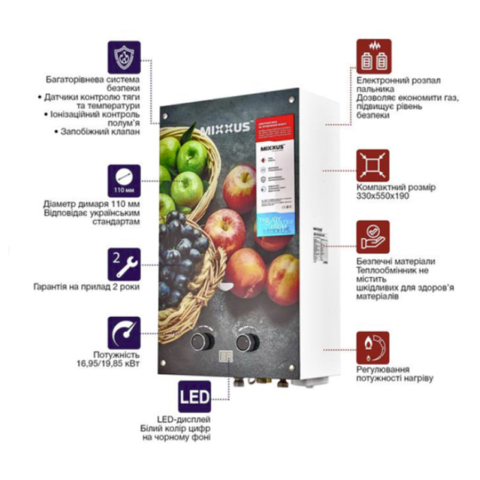 Газовая колонка MIXXUS GWH-0310 – это современный, стильный и функциональный нагревательный прибор с открытой камерой сгорания. Для запуска процесса розжига при открытии крана сети ГВС необходимо обеспечить электропитание, вставив в специальный отсек 2 батареи.